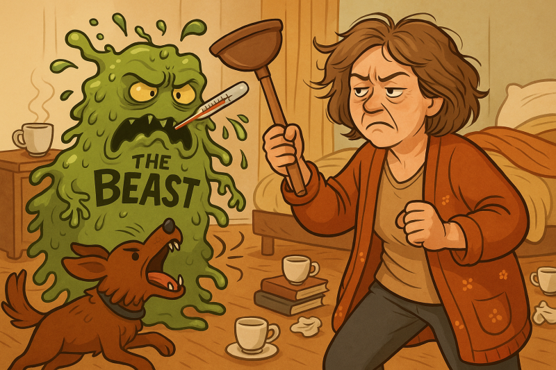 Ik had nooit gedacht dat ik zoveel slijm kon stockeren — in mijn neus, mijn longen, werkelijk overal. Shara (de hond) deed nog een poging om de blaaskapel te overstemmen, maar zelfs zij moest zich gewonnen geven. Slapen leek het enige dat nog functioneerde: slapen, slapen, en tussendoor… slapen. En terwijl ik stilaan voelde dat “the beast” de strijd aan het verliezen was, wist ik ook: mijn strijd is nog niet gestreden.
